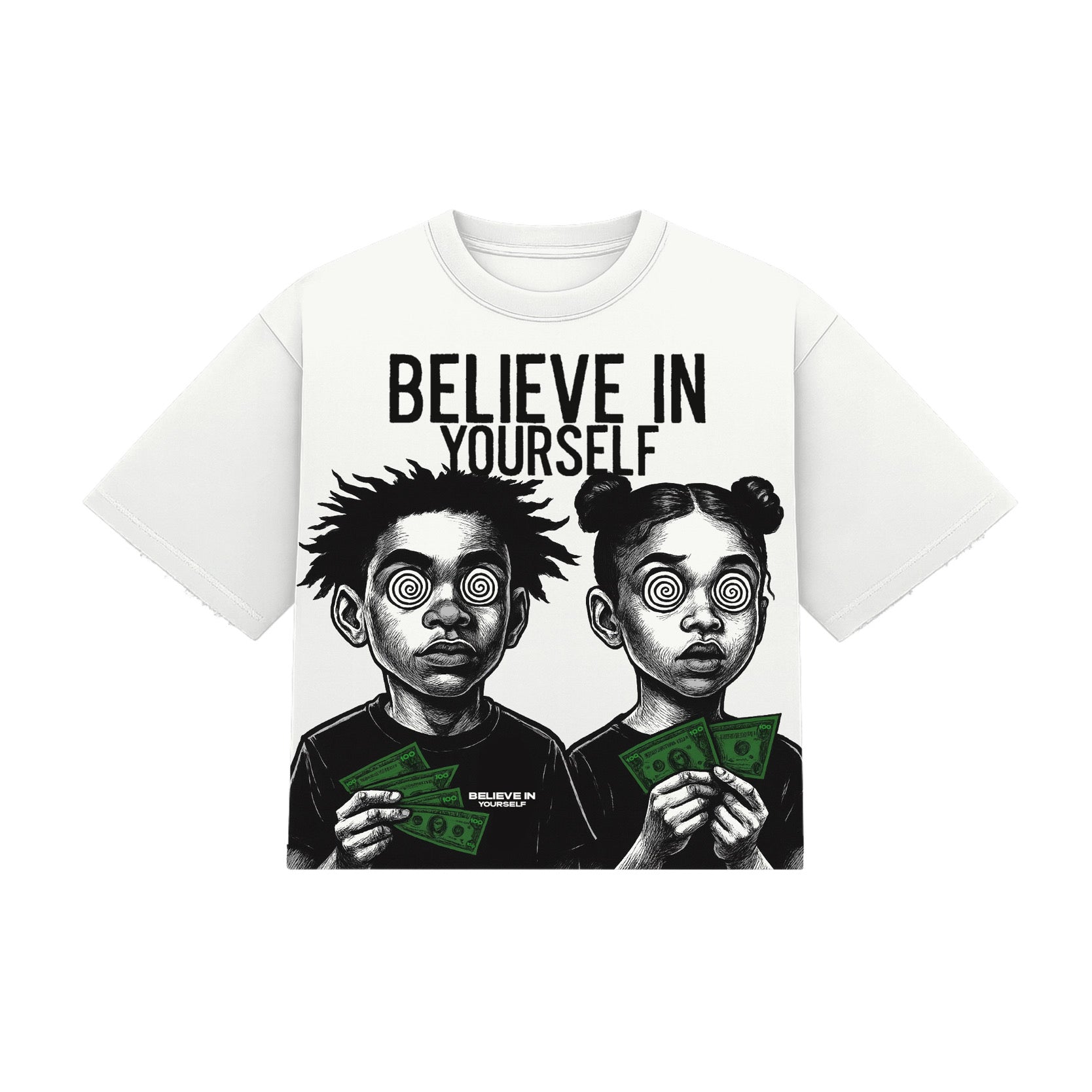 With “BELIEVE IN YOURSELF” stamped across the top, this tee is a reminder that everything starts with confidence, hustle, and mindset. It’s gritty, powerful, and instantly eye-catching; the perfect mix of message and streetwear.